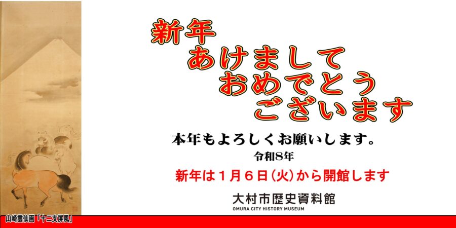 PREV2026年 1月NEXT日月火水木金土2829303112345678910111213141516171819202122232425262728293031 PREV2026年 2月NEXT日月火水木金土12345678910111213141516171819202122232425262728 休館日 お知らせ一覧はこちら 2026年1月1日 令和8年 新年明けましておめでとうございます 2025年12月19日 年末・年始休館日のお知らせ 2025年11月5日 展示図録「Never Forget ー大村と戦争・その記憶と継承ー」販売中 2025年7月26日 大村市歴史資料館 展示解説シート 2025年5月6日 近代資料室でカブトの置物を展示しています Page 1 of 41234» フロアマップ 企画展示室 常設展示室 シアター プロローグ他 所蔵資料DB 刊行物 大村市近代資料室